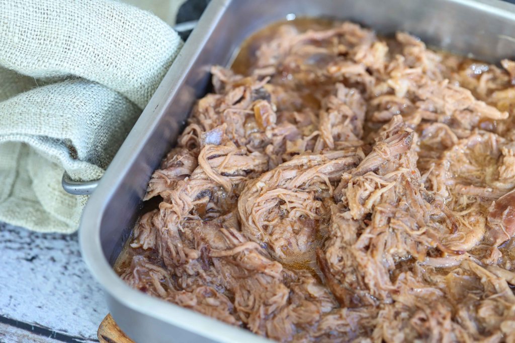 Add cooking juices to the shredded pork, according to preference. Or simply return the pork to the slow cooker and mix well.